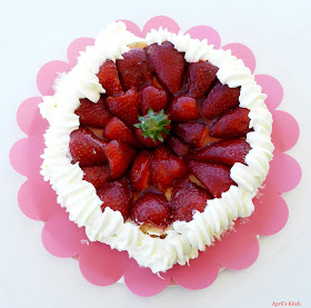 Nota Diciembre 2012: Hice la decoración diferente, colocando las fresas de pie, sin quitarles el pedúnculo. También encontré en Lidl (*) unos sobrecitos para hacer mucho más cómodamente la gelatina que se pone encima de las fresas, se llama "cobertura para tartas" de la marca Belbake (en polvo). Extendí la nata con una espátula como si fuera un buttercream. En el interior Mermelada de naranja de "Els Fruits Saborosos".